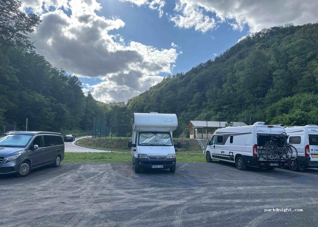 Hikers' parking lot, free of charge, without services, closest parking to the Reichsburg, 400m to the Cochem town sign, 21min walk to the town center, relatively quiet at night, flat gravel surface, only free parking space for camper vans in Cochem