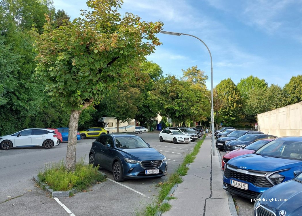 Hötzendorfstrasse, free, unlimited time. 10 minutes to the main square. Full of commuters on weekdays, empty in the evenings. Ideal for overnight stays. Sometimes a train passes by, otherwise it's totally quiet here. Lots of diagonal/lengthwise parking spaces.