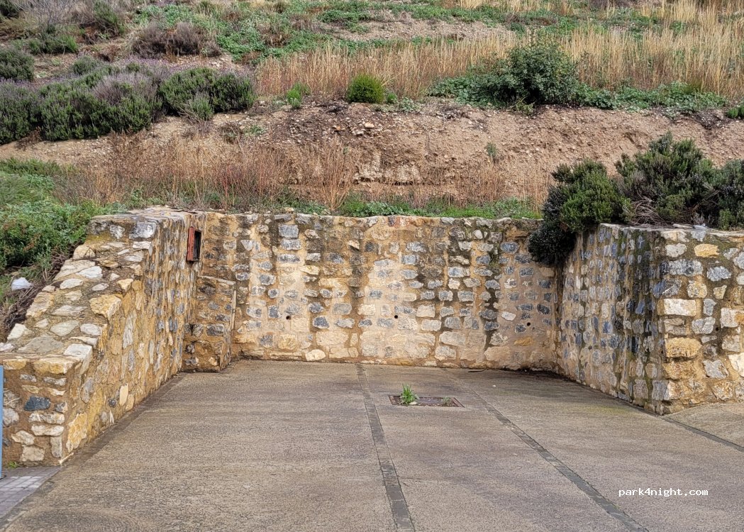 ATENCIÓN, acceso muy complicado con una pendiente superior al 15%. el agua está bajo llave, tienes que pedirla a la policía local, aunque hoy estaba abierto. casi imposible pernoctar, porqué está en una cuesta... el pueblo es muy bonito con muchas cosas por ver y los bares y restaurantes están geniales.