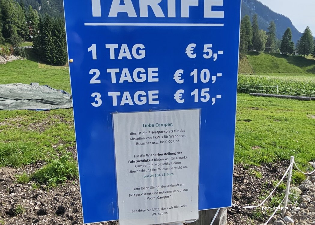 Super schöner Ort. Wohnmobile in allen Größen. Nur Parken, kein Camping. Kein Müll, nicht einmal ein Mülleimer. Perfekte Aussicht und Ausgangspunkt für Wanderungen. Vor Ort gibt es eine kleine Hütte mit frischen Produkten vom Bauernhof. Milch ist ein Muss.