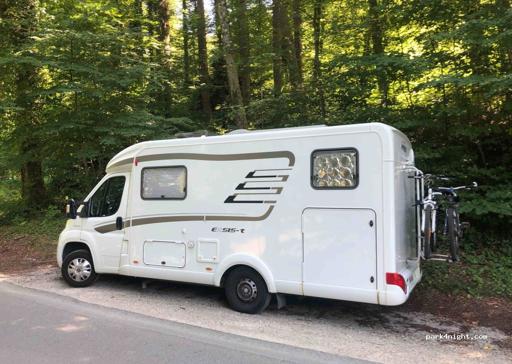 We only stopped by for a stroll around the wonderful castle, since I wouldn't cross the wooden bridge with my RV. The spot is shady but inclined, perfect for a visit not for sleeping, at least for me.