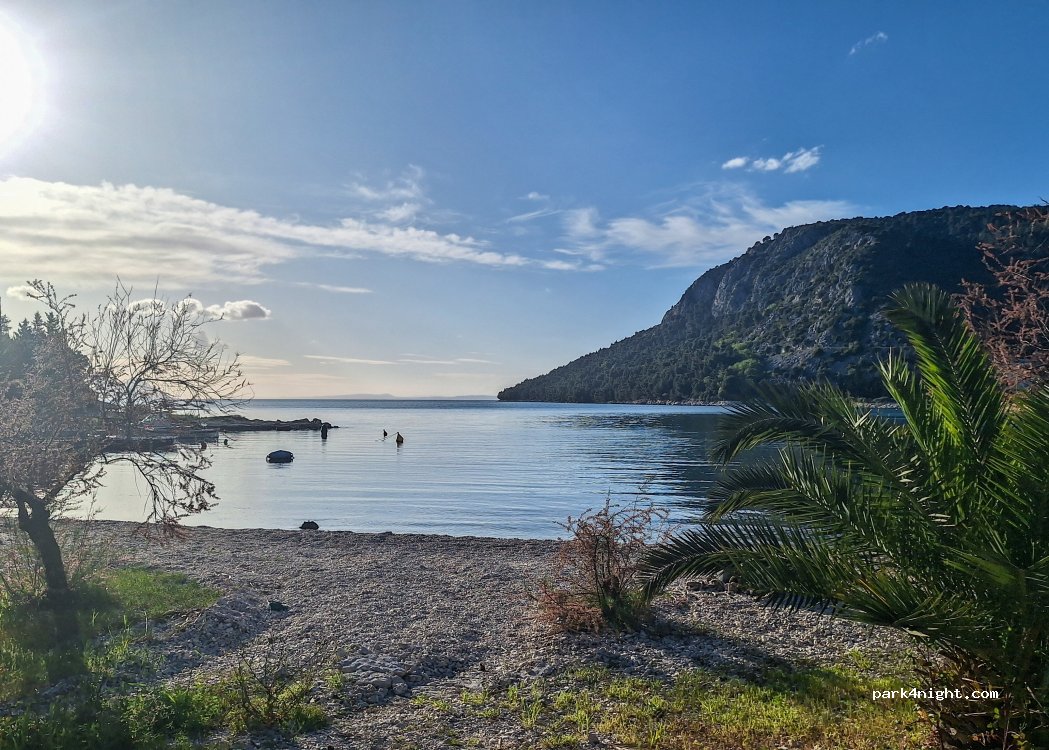 Places de parking sous les oliviers au bord de la plage à 20€ la nuit avec douches et toilettes. Restaurants/bar juste à côté. La route pour y aller est en sens unique donc pas de problème avec un van même si l’entrée du parking peu être étroite. Il y avait des campings car sur place. Super couché de soleil.