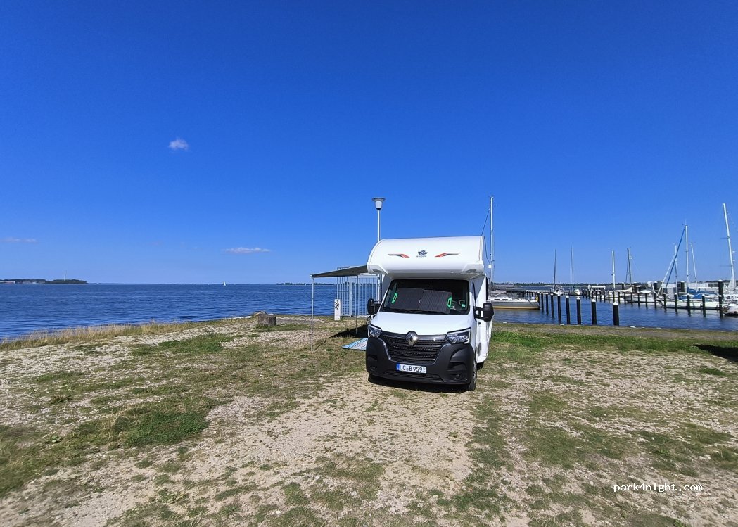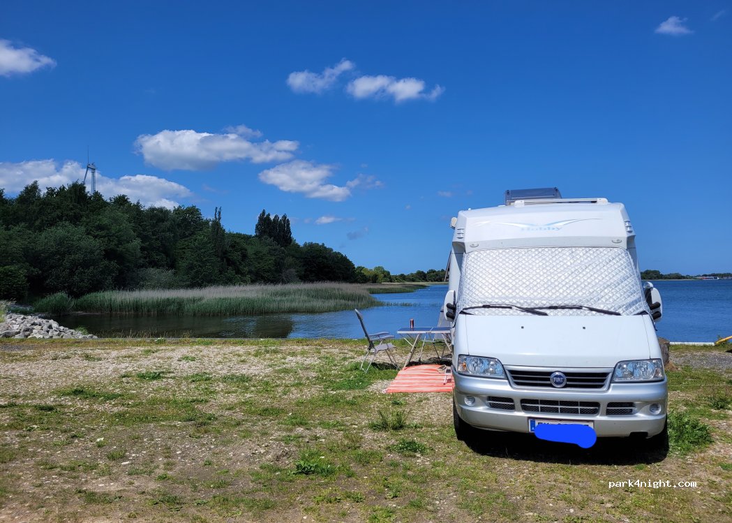 Quiet parking space with a fantastic view over the Strelasund. The coastal cycle path runs right past the site and leads to the Hanseatic city of Stralsund or via Parow towards Darß. For 24 hours you pay the amount to the groundskeeper, who comes by in the evening. With the key handed over you then have access to all services. Attention! The street is Zur Schwedenschanze, drive to the end