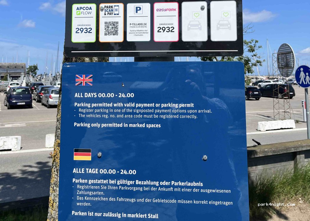 There is a ticket machine on site where you can register your vehicle. Don't use this one. Use app payment. Then you can stay for a day for DKK. 57.50 Nice place with easy access to the city and Kronborg Castle.