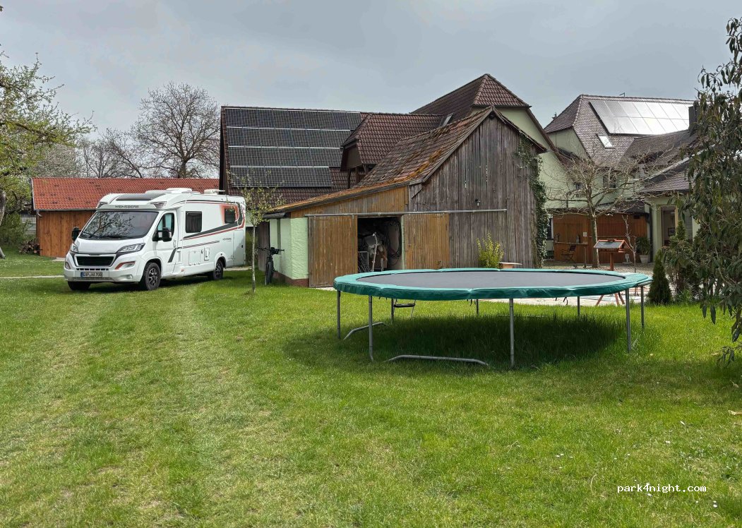 Hello, we have a parking space in the garden of our "Gasthof zum Stern." It's unpaved, but secure. The space is for one night, and we would be happy if you would enjoy dinner or breakfast (€12 for adults, €1 for children per year of age) at the inn. You can use the play equipment in the garden. The restroom is located at the reception. Reservations are not necessary, as we can accommodate three or four RVs. Contact: wlanprivat Password: telekom2005