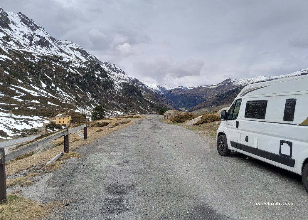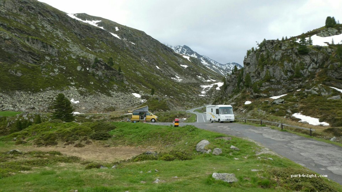Parking lot with benches (great view) on Flüelapassstraße. Another paved parking lot is below the side street. Camping and overnight stays prohibited.