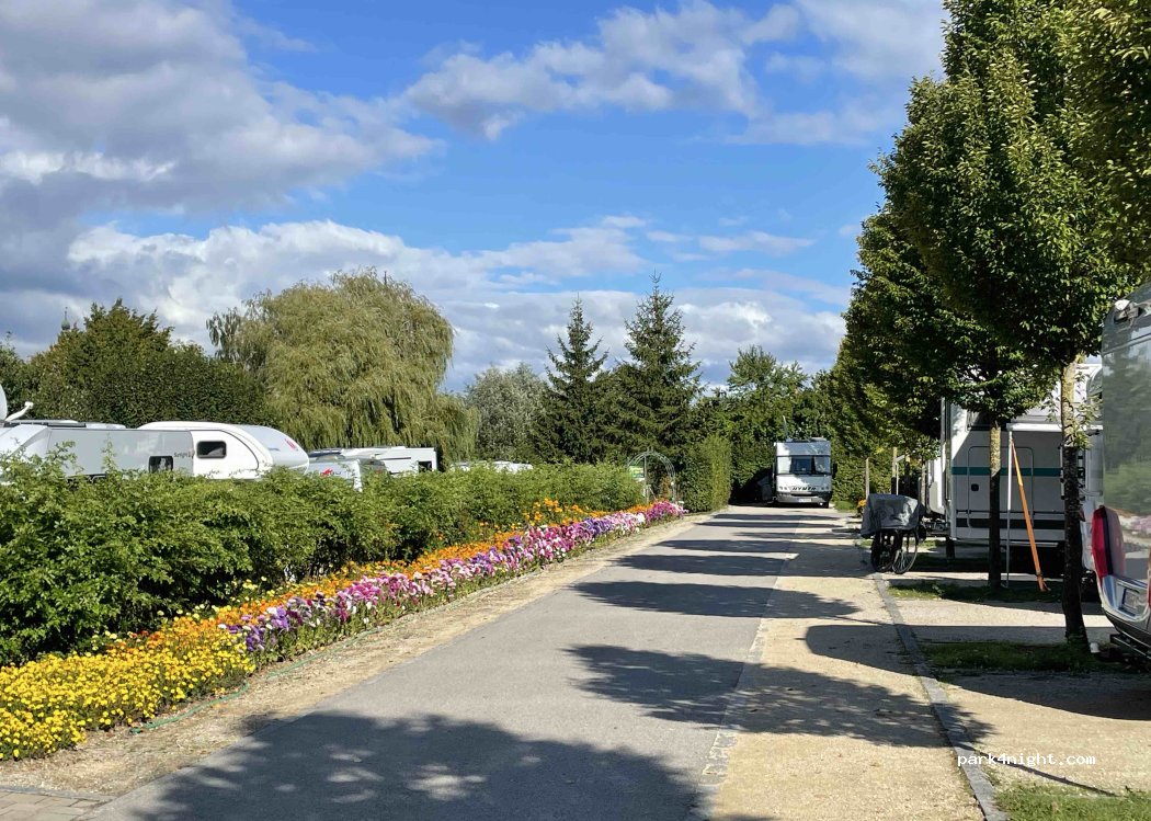 très propre, tous les emplacements pris. on s'est garé derrière. on a payé ne sachant pas si il fallait aussi payer derrière. tout est automatique. on a payé au distributeur. informations que en Allemand. on voulait laver du linge. on n'a pas compris. une porte fermée avec un seul endroit où mettre des pièces. ne sachant pas on n'a pas pu utiliser les services.. le site est très bien.