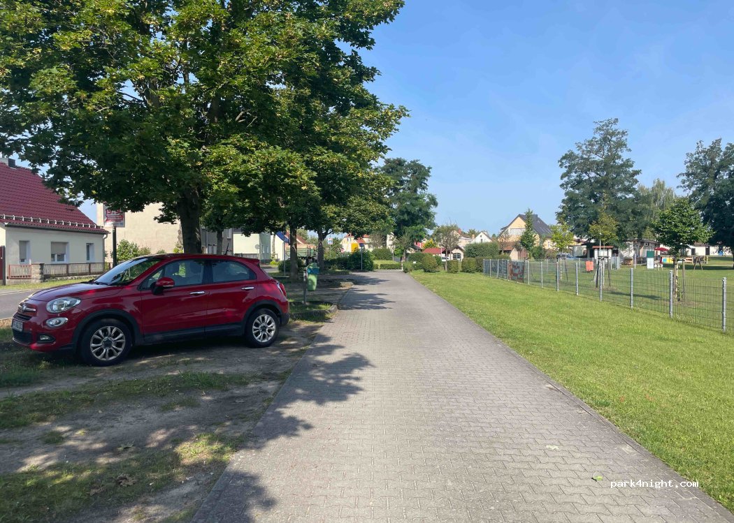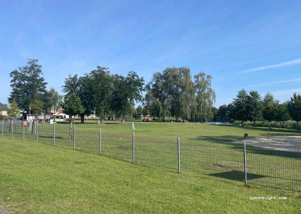 Parkplatz im Schatten vor einem Freizeitbereich mit Strand an einem See. Die Straße ist tagsüber etwas befahren, keine Beschränkungsschilder. Der Boden auf dem Parkplatz ist nicht stabilisiert, wir machten eine Pause. Dies ist für CCs mit einer maximalen Länge von weniger als 6 m geeignet. Eine kleine Bar ist nebenan.