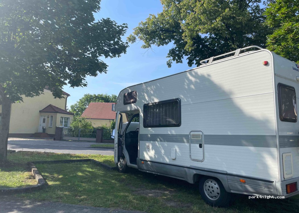 Parking in the shade in front of a leisure area with a beach in a lake. The road is a little busy during the day, no restriction signs. The ground in the parking lot is not stabilized, we stopped for a break. This is suitable for CCs of less than 6m maximum. A small bar is next door.
