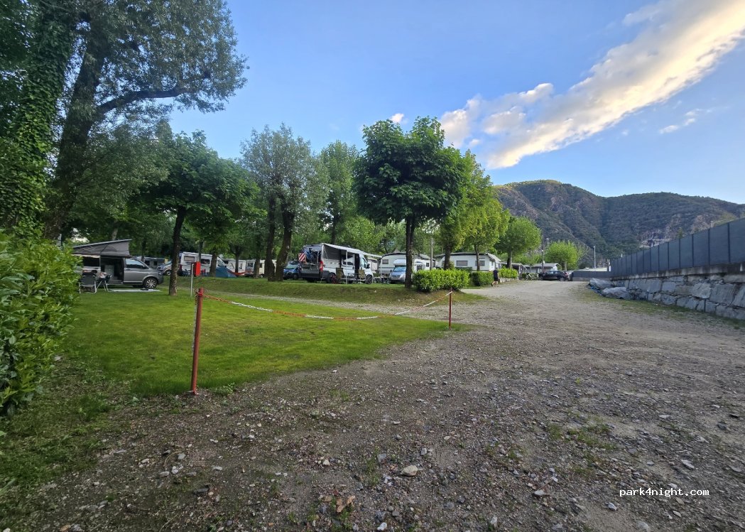 Grand camping au bord du lac et du village. Départ excursions pour les îles Borromeo (à faire absolument !!) à 5mn à pieds. Sanitaires très propres, piscine (bonnet de bain obligatoire), 2 restaurants et 1 supérette (très chère !). 63€ pour 1 CC + 3 pers, taxe de séjour en plus. 1 étoile en moins pour la plage / lac : vaseux, eau trouble, algues, très désagréable de s’y baigner.