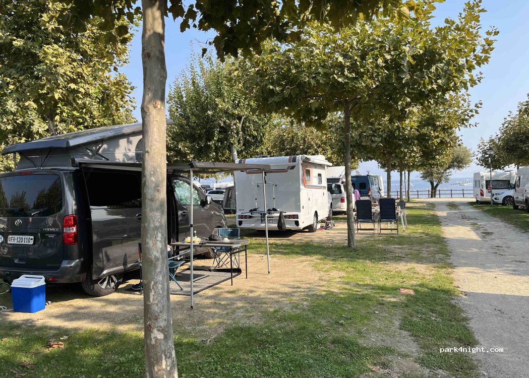 Très bon accueil en français, malgré l’affiche complet à l’entrée. Sanitaires impeccables. Emplacements spacieux certains avec point d’eau. Bonnet de bain obligatoire pour la piscine. Oublié la baignade dans le lac, la plage est boueuse et l’eau envahit par les algues… dommage quand on voit la clarté et la couleur de l’eau sur le reste du lac… 01 Cc, 3 adultes, 3 nuits, env 200 euros.