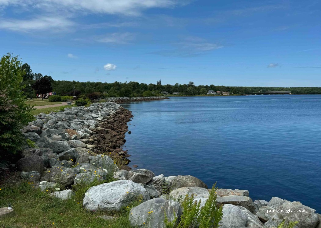 Estacionamiento al lado de un centro de visitantes donde puedes obtener wifi y usar los baños (muy limpios). Hay un gran parque con césped, juegos infantiles y mesas de picnic junto al río. Es hermoso.