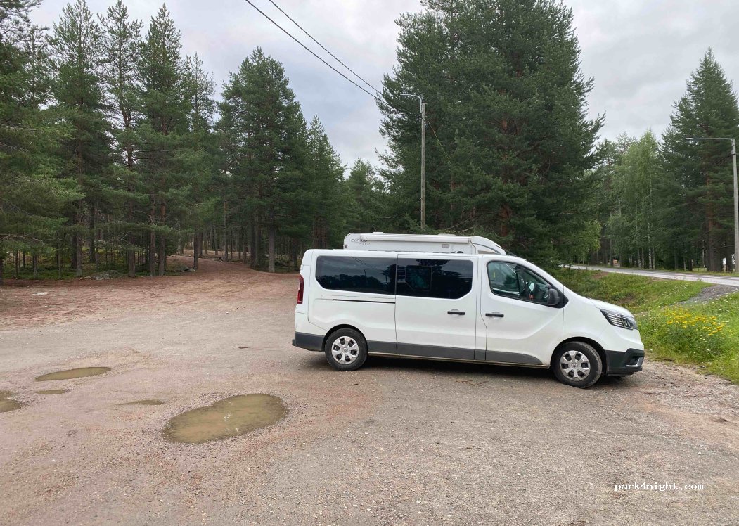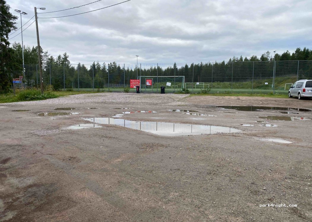 Großer unbefestigter Parkplatz neben einem Fußballplatz. Nachts sehr ruhig