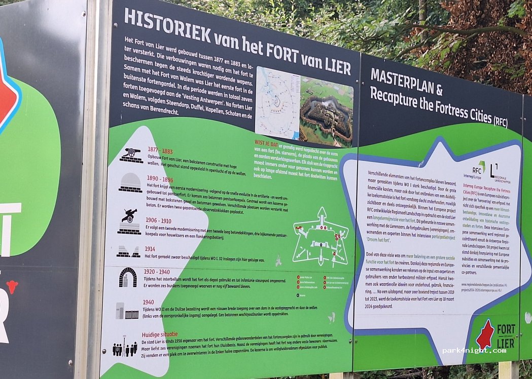 Mooie rustige plek, voor het hek van de Fort van Lier. Deze is op afspraak te bezichtigen. Er zitten nu verschillende clubs/verenigingen in en dan rijden er wel veel auto's langs maar 'snachts is het rustig! Als het hek open is, durf naar binnen te lopen en te kijken naar de historische ruïnes, ik ben niet geweigerd :-). Mooie en rustgevend plekje om te overnachten, er komen wat (honden)wandelaars. Stevige ondergrond (steen). Je kunt ook een wandelingetje maken om de grachten van het Fort (half uurtje). Het stadje Lier is zeker een bezoekje waard! ongeveer een half uur wandelen. Mooi historische gebouwen en leuke winkelstraten. Ook genoeg restaurantjes en een Mac dichtbij. Er is een bankje aanwezig en een hondenprullebak, verdere geen voorzieningen!