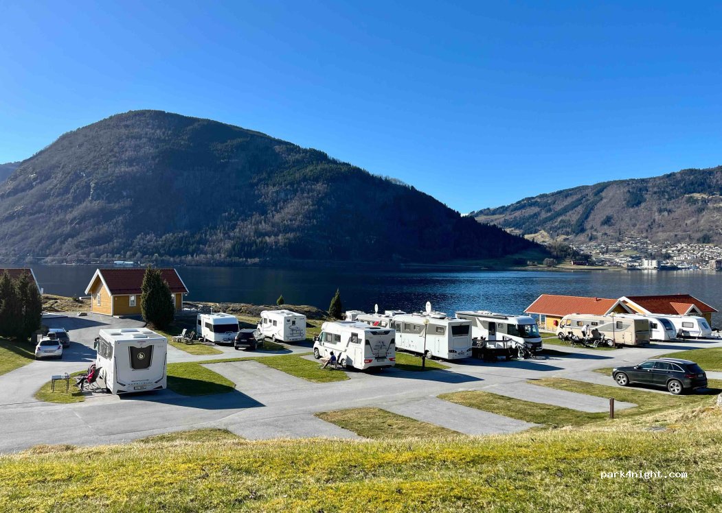 Super gepflegter Platz mit perfekten Sanitäranlagen. Terrassenförmig angelegte Stellplätze, jeder kann auf den Fjord schauen. Für Wohnmobile geteerte Bereiche, daneben jeweils Rasenflächen. Wohnwagen stehen ganz auf Rasen. Wir sind diesen Platz sogar zweimal angefahren, weil er so schön gestaltet wurde und auch nachts ruhig ist.