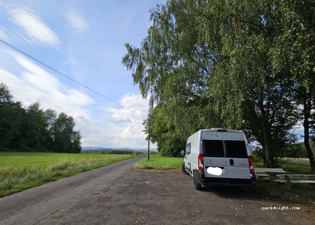 Lugar tranquilo con mesa de picnic pero sin papelera. Ofrece bonitas vistas a los campos y un panorama de la zona de Eifel, al otro lado del Mosela. Buen restaurante a poca distancia en el pueblo cercano. Cuidado: por la mañana un local llamó a nuestra ventana para decirnos que no podíamos acampar allí y que llamaría a la policía. Sin embargo, no hay señales de "prohibido acampar".