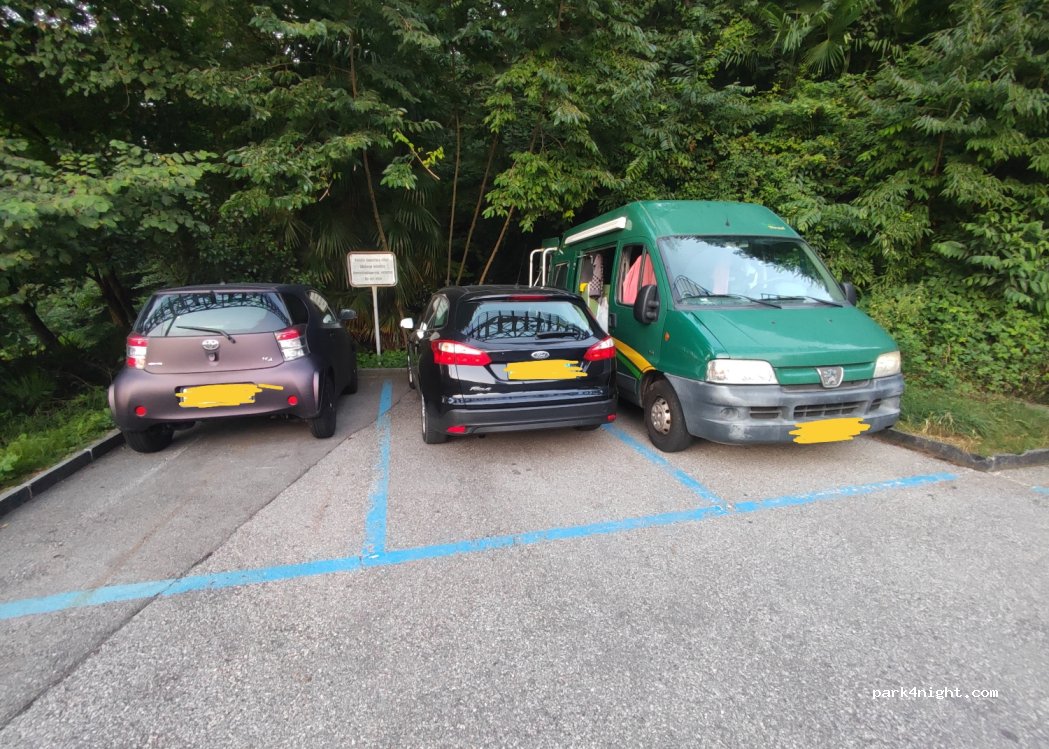 Un petit parking à la gare routière. Ne convient pas aux campeurs mesurant plus de 5,5 m. Une légère pente, mais faisable. Vous vous trouvez sous une voie ferrée allant du train à la montagne, mais elle ne circule pas la nuit. Idéal pour une nuit.
