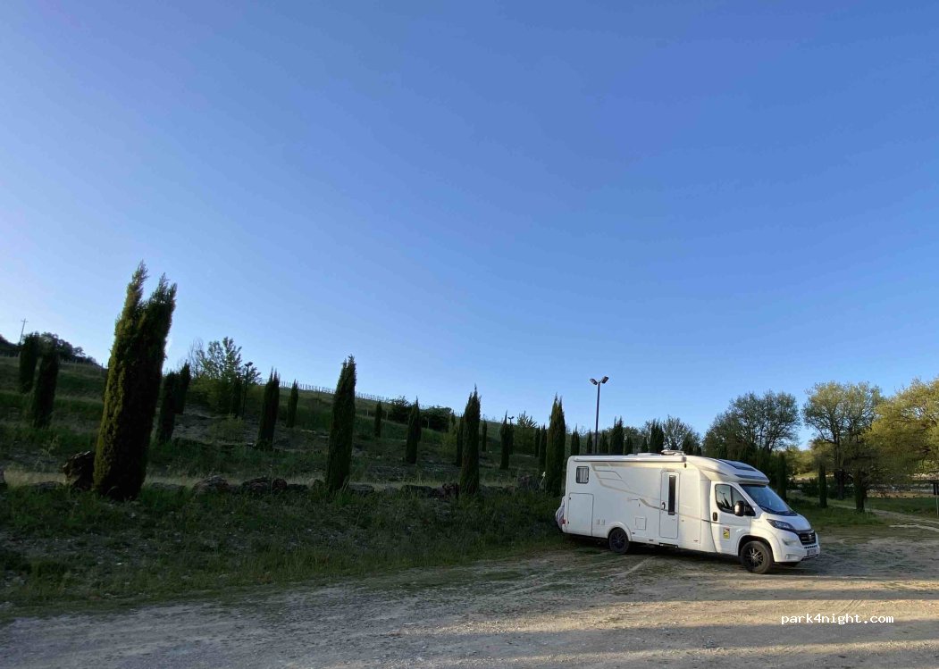 Wir waren eine Nacht auf dem Parkplatz gegenüber von der Pizzeria und dem Schwimmbad. Der Platz ist super. Es war mega ruhig und es ist eben. Wir waren das einzige Fahrzeug und konnten uns somit auch mit 7 m ausbreiten. Wir waren in der Pizzeria essen. Wir haben selten so gut gegessen. Ganz toller Service, wunderschönes Ambiente und der Preis für 2 Essen, 2 Gläser Wein,Wasser,2 Espresso 37 Euro.