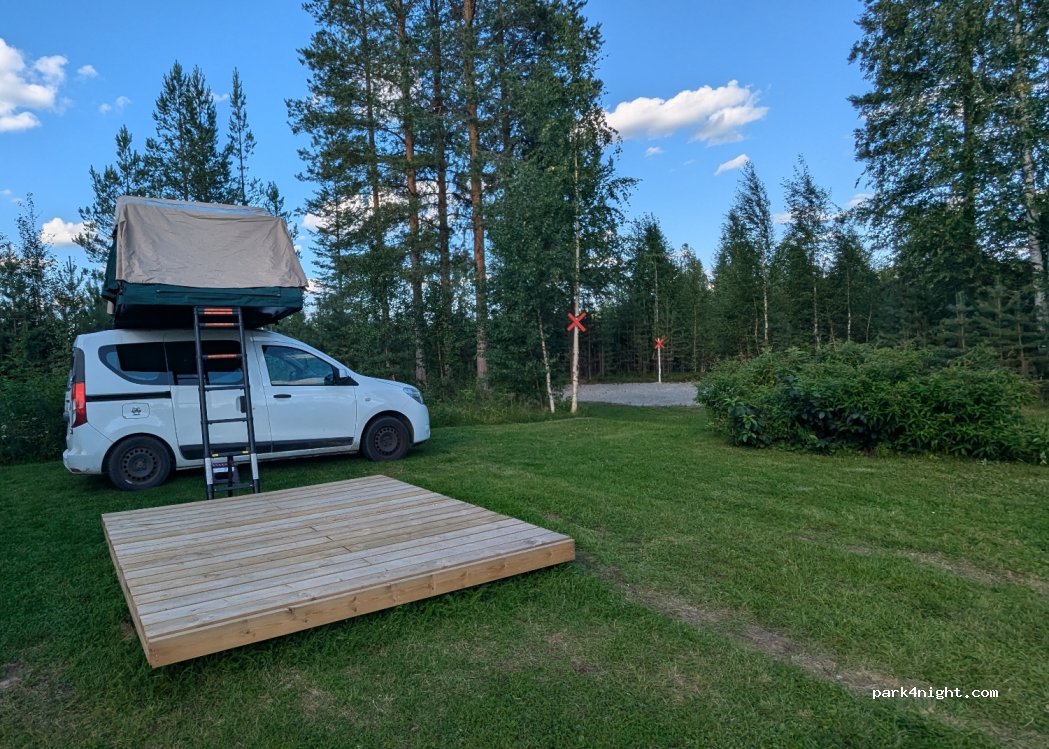 Kleiner privater Platz, optisch sehr ansprechend. Nette und unkomplizierte Kommunikation. Es gibt Holzplatfformen an die man sich stellen kann, echt praktisch. Top. Feuerstelle und Dusche/WC vorhanden. Zugang zum WC etwas abenteuerlich und gern in gesellschaft von Fröschen :D aber absolut sauber und modern. Storforsen fußläufig erreichbar. Hätten gern mehr Sterne vergeben. Dachzelt möglich