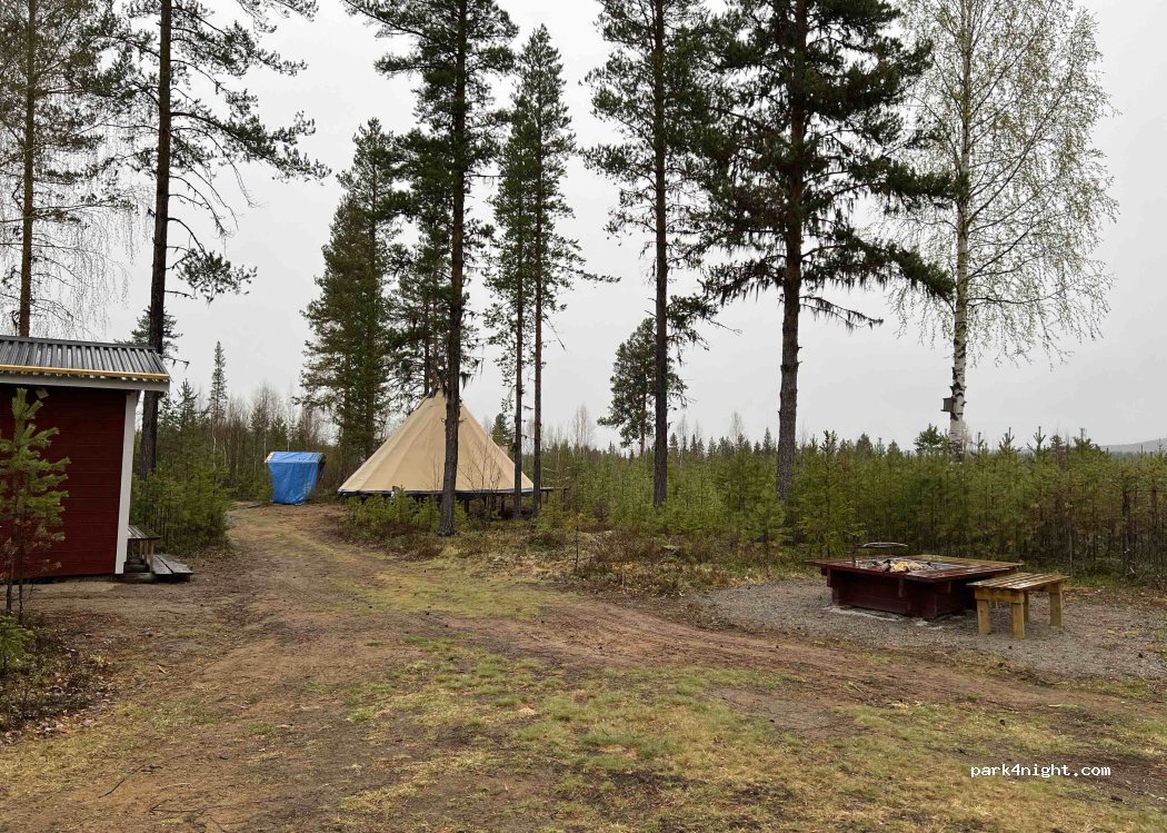 Electricity, water, shower, toilets. On the large site there is a spacious tent (Lavvu) with a fireplace/cooking area and seating. There are other fireplaces/smoking ovens on the site. These can be used free of charge. We offer firewood in boxes or sacks. The site is within walking distance of the Storforsen. About 1 km through the forest.