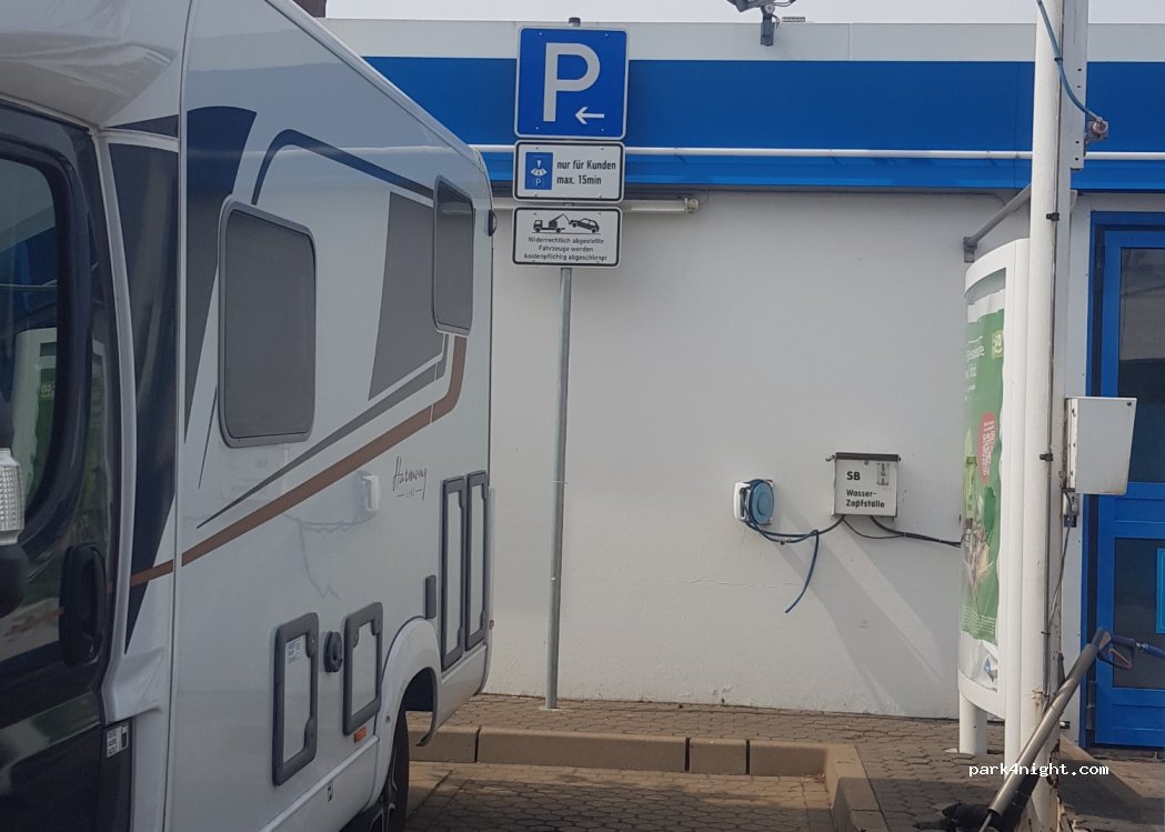 Wasser gibt es auf der Hinterseite direkt neben der Waschstrasse. 1,-€ für knappe 30l