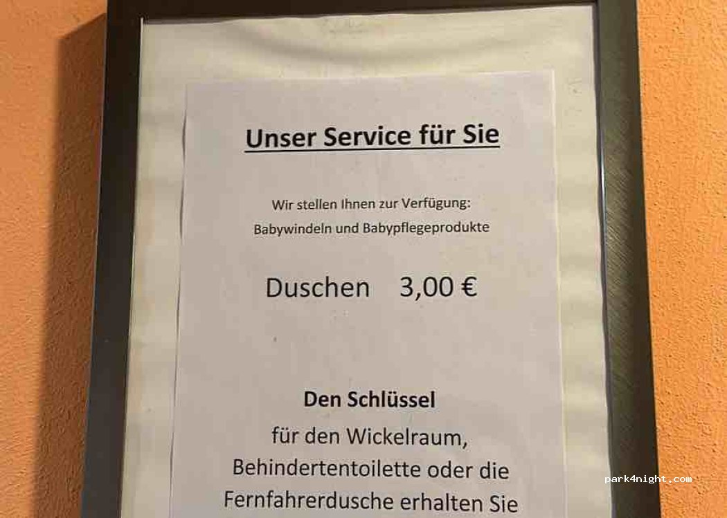 Aire de repos avec de bonnes possibilités de stationnement. Les toilettes sont ouvertes 24h/24 dans l'aire de repos moyennant un supplément. Les douches sont également payantes.