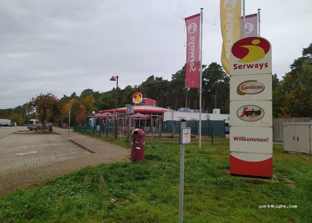 Rest area with good parking facilities. Toilets are open 24 hours a day in the rest area for a fee. Showers also chargeable.