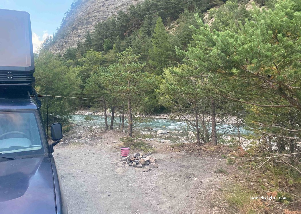 Au bord d’une rivière, légèrement plus haut sur la rive. Au bout d’un chemin en impasse, attention quelques branches peuvent rayer la carrosserie.