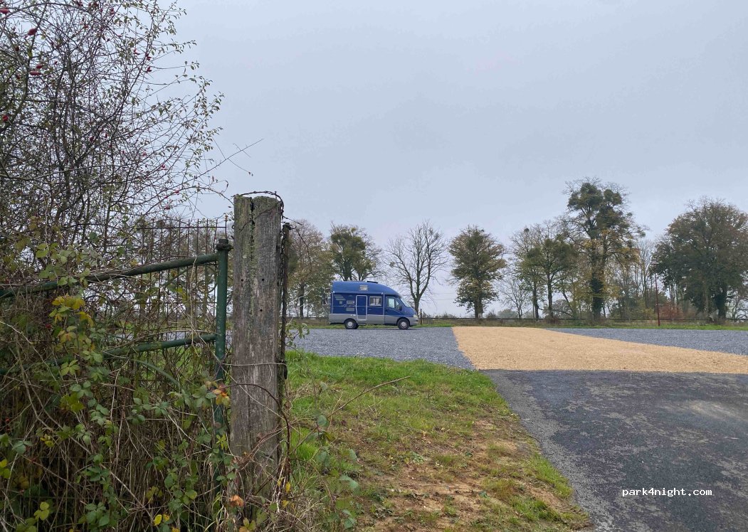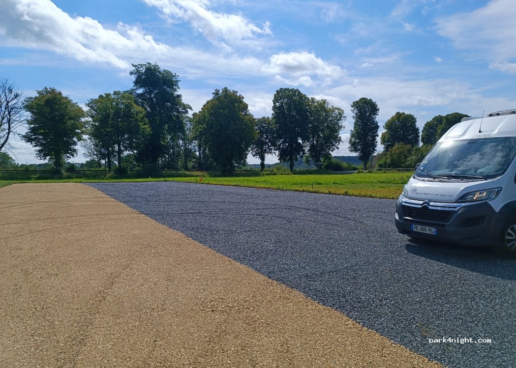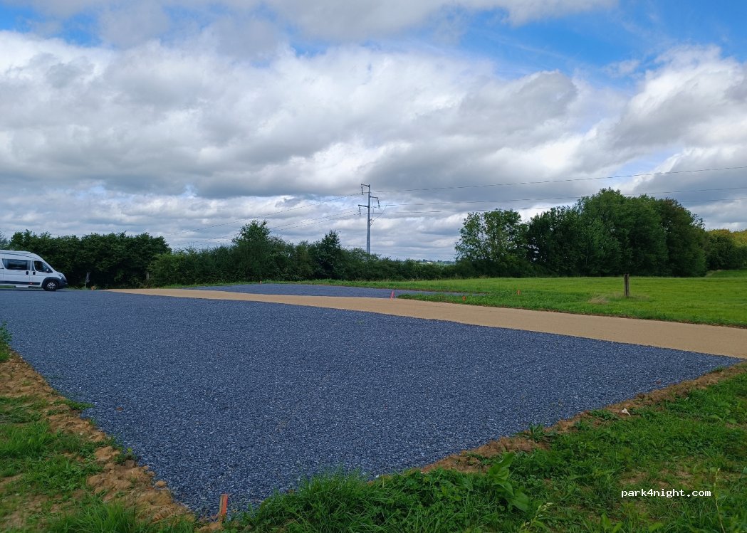 Parking où l'on peut dormir avec emplacements avec des graviers et plats. Pas d ombre pour le moment mais des arbres ont été planté. Proche de la route qui est effectivement passagère tôt le matin même le dimanche. Dommage que il n y ait pas de service.