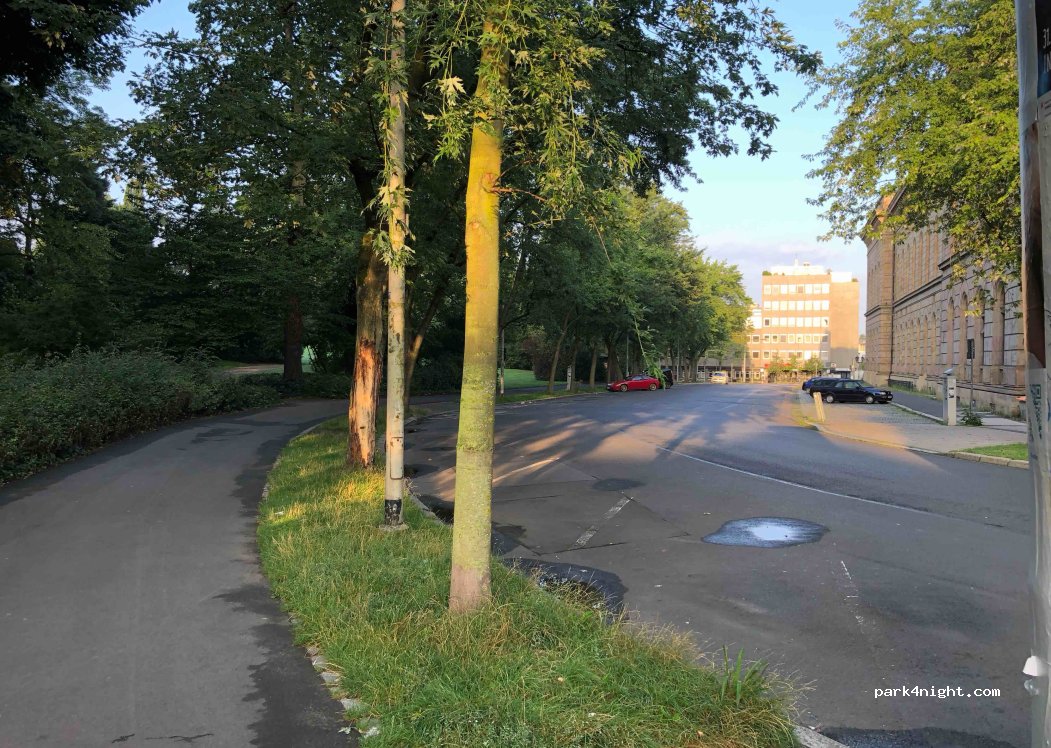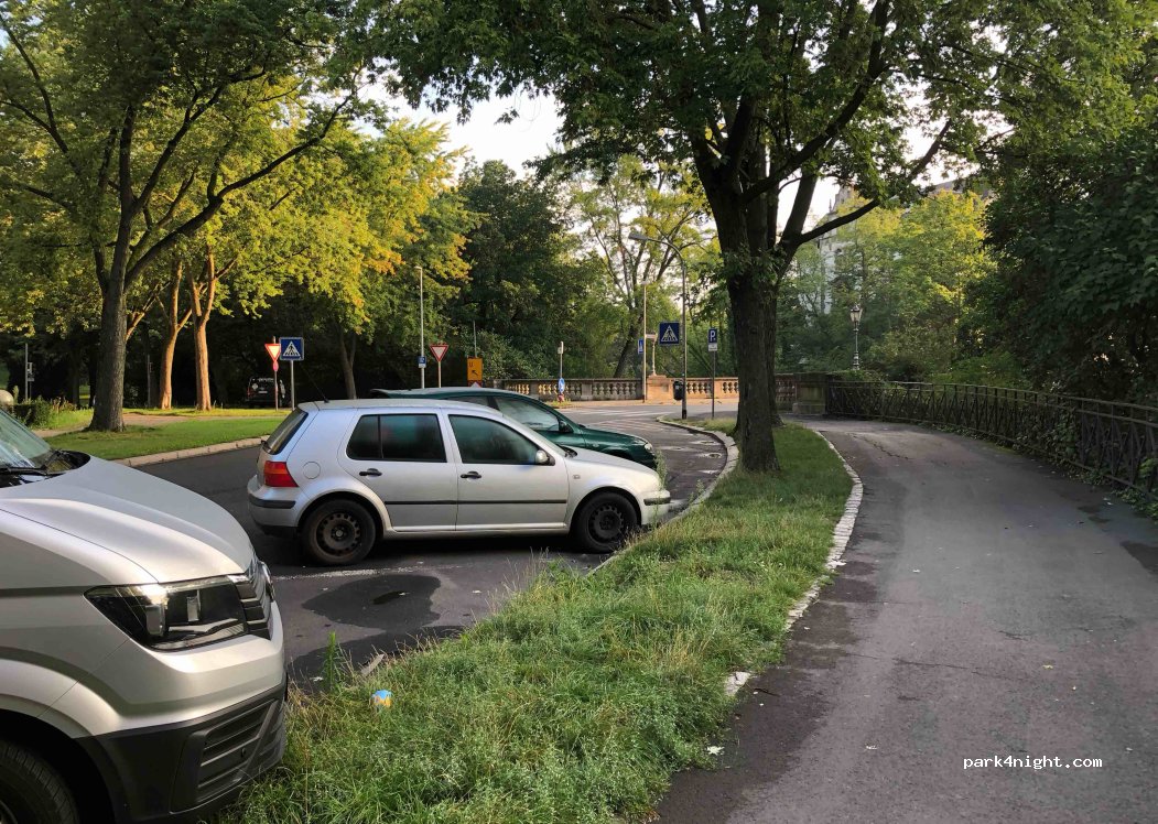Parking dans un parc. Des frais s'appliquent du lundi au samedi de 9h à 20h. Bien pour une nuit. Occupé pendant la journée, calme la nuit et adapté pour une nuit.