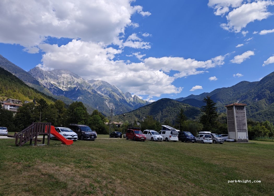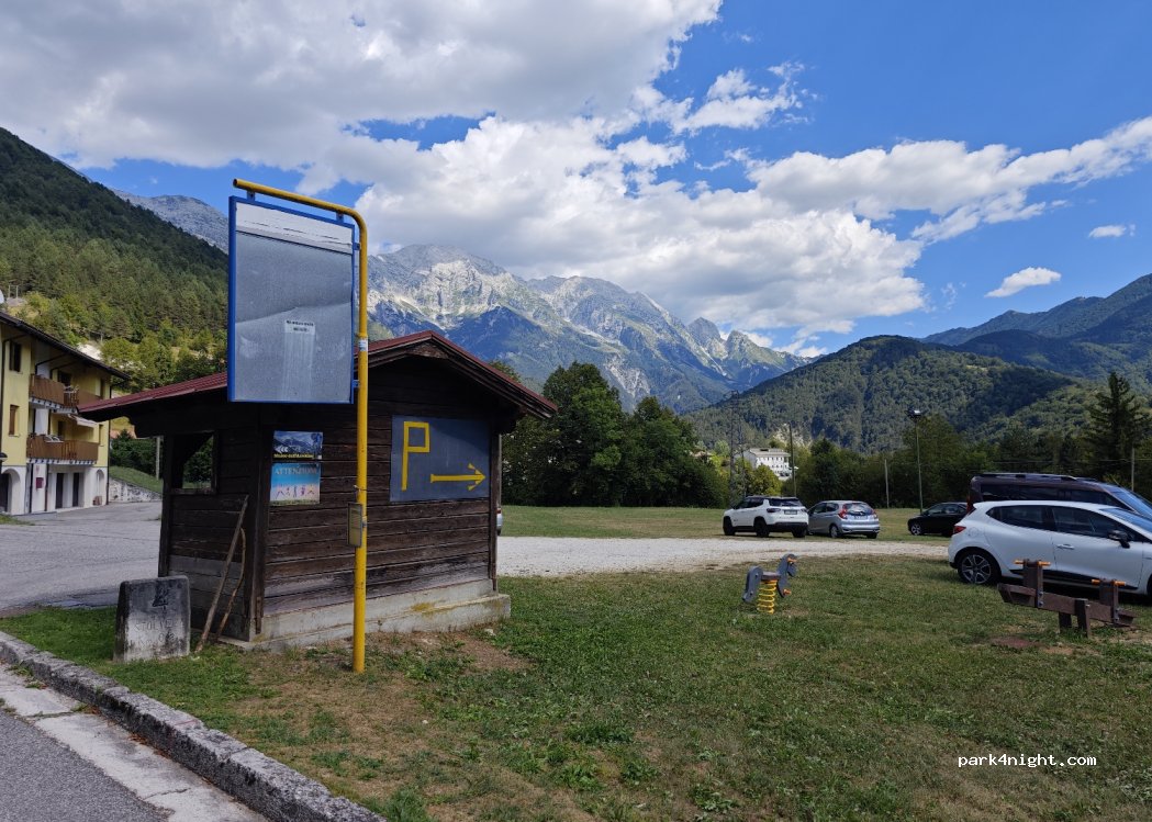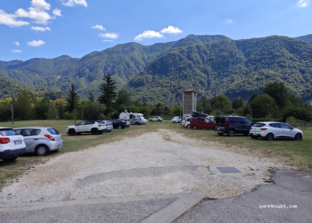 Parcheggio ufficiale accanto al villaggio. Nessun cartello di divieto per il parcheggio notturno. Parcheggio sull'erba, nessuna ombra. Cestino della spazzatura alla stazione degli autobus. Bella vista sulle montagne.