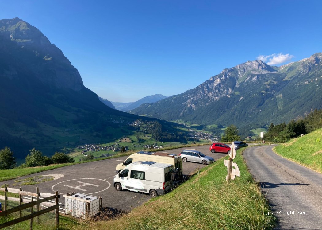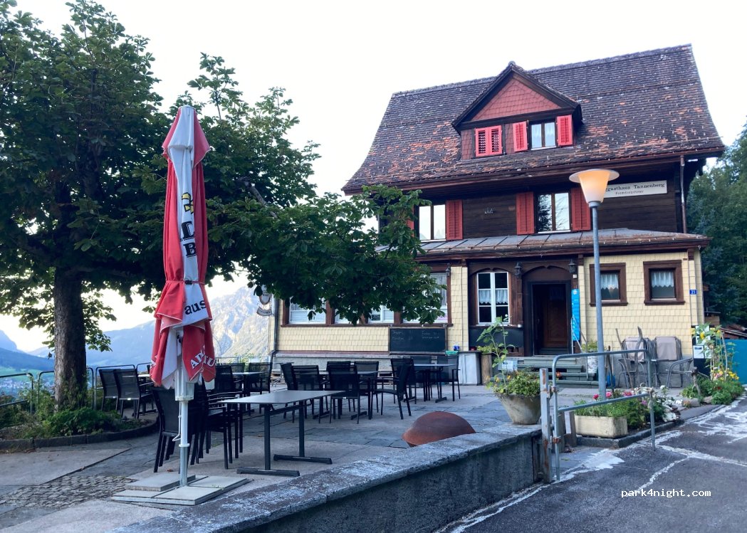 Parkplatz vom Berggasthaus Tannenberg. Der Stellplatz hat eine gerade Fläche und man hat eine wunderschöne Aussicht aufs Tal und in die Berge. Es hat Platz für 4-6 Fahrzeuge. Mit unserem VW Crafter konnten wir ohne Probleme zu diesem Platz fahren.