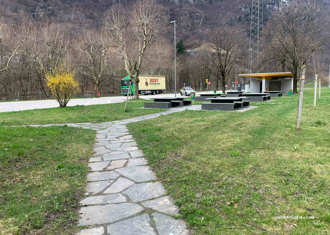 Motorway rest area. Truck and car parking but we were able to park with our motorhome by putting the front wheels on the grass.