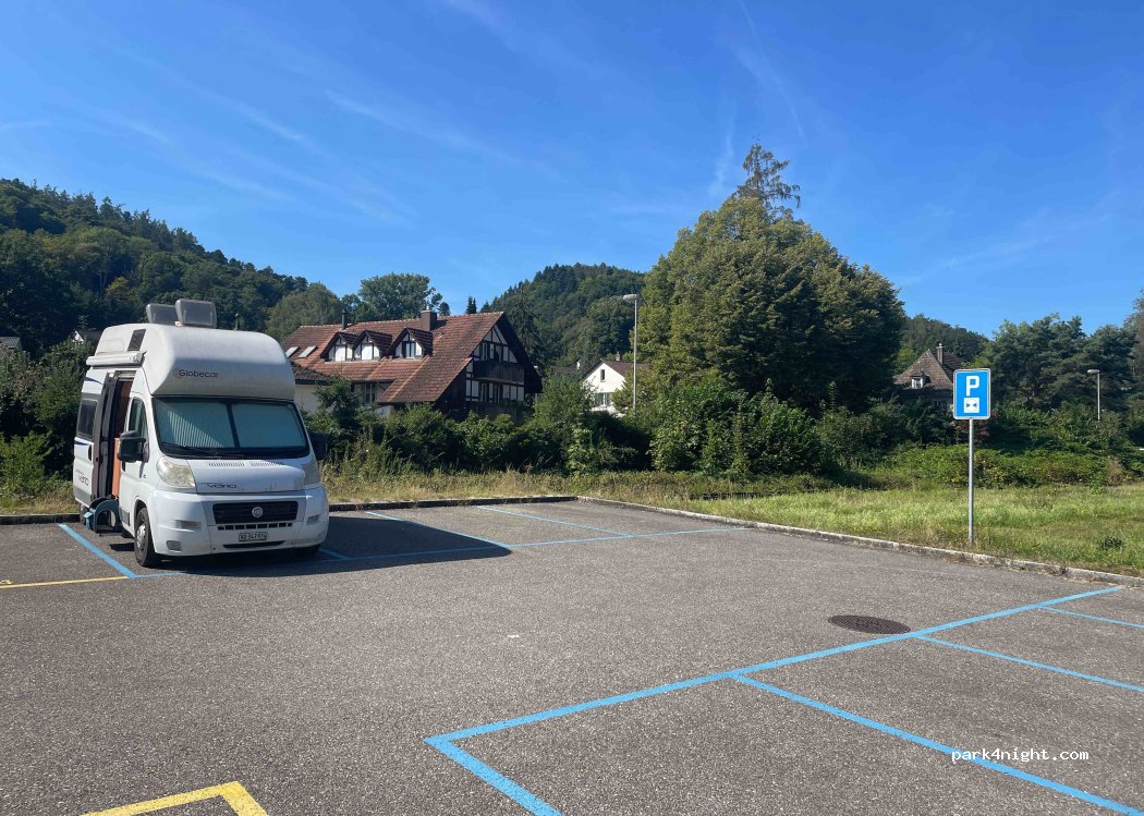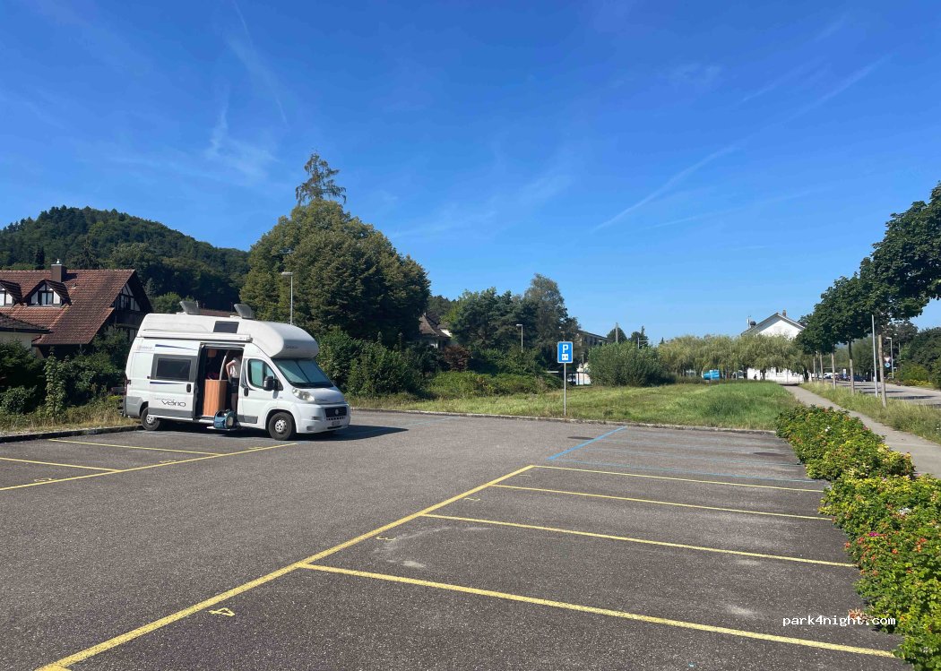 6 spaces in the relatively flat blue zone at the back of the car park. Free. No restrictions for the night. Ideal for visiting Buren.