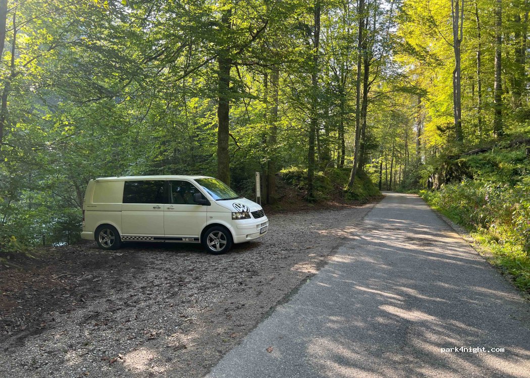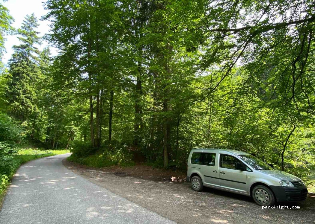 Un aparcamiento muy bonito en medio del bosque, junto al río. Hay dos plazas de aparcamiento a unos 100 metros una de la otra. Si la primera está llena, prueba la segunda.