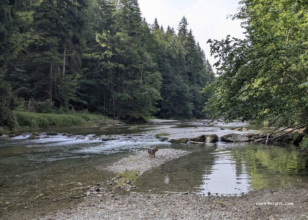 Schöner Ort für eine Nacht, wir konnten unmittelbar am Flussufer stehen. Die Parkbuchten werden tagsüber auch viel von einheimischen genutzt. Weiter die Straße runter befindet sich ebenfalls ein großer Parkplatz der Gaststätte, auf dem das Campen vom Eigentümer geduldet ist