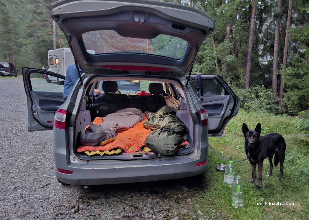 Amplio aparcamiento, suficiente para pasar la noche, separado de la carretera por árboles, pero sin servicios. Había muchos coches y autocaravanas pasando la noche con nosotros, pero aún así había mucho espacio.