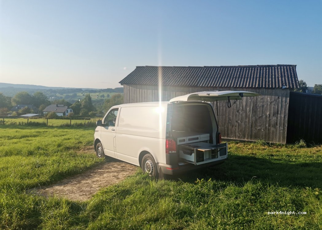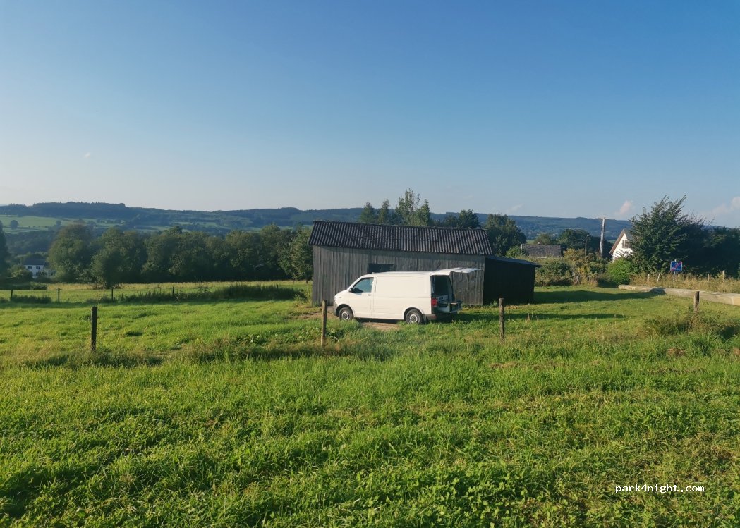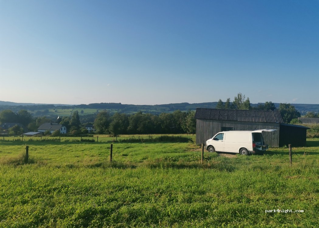 3 Plätze für einen Transporter hinter einem kleinen Gebäude auf einem Feld. Briefkasten, um das Geld beim Eigentümer zu hinterlassen. Sehr schöne Aussicht, ruhig. Wald 100 Meter entfernt. Der Eigentümer stellt eine Trinkwasserleitung zur Verfügung. Kein WC, kein Strom, kein Abwasser. Ruhiger Ort. Wir bitten Sie, keinen Lärm zu machen. Mountainbikestrecken 50 Meter entfernt. Supermarkt und Ortszentrum 3 Autominuten entfernt.