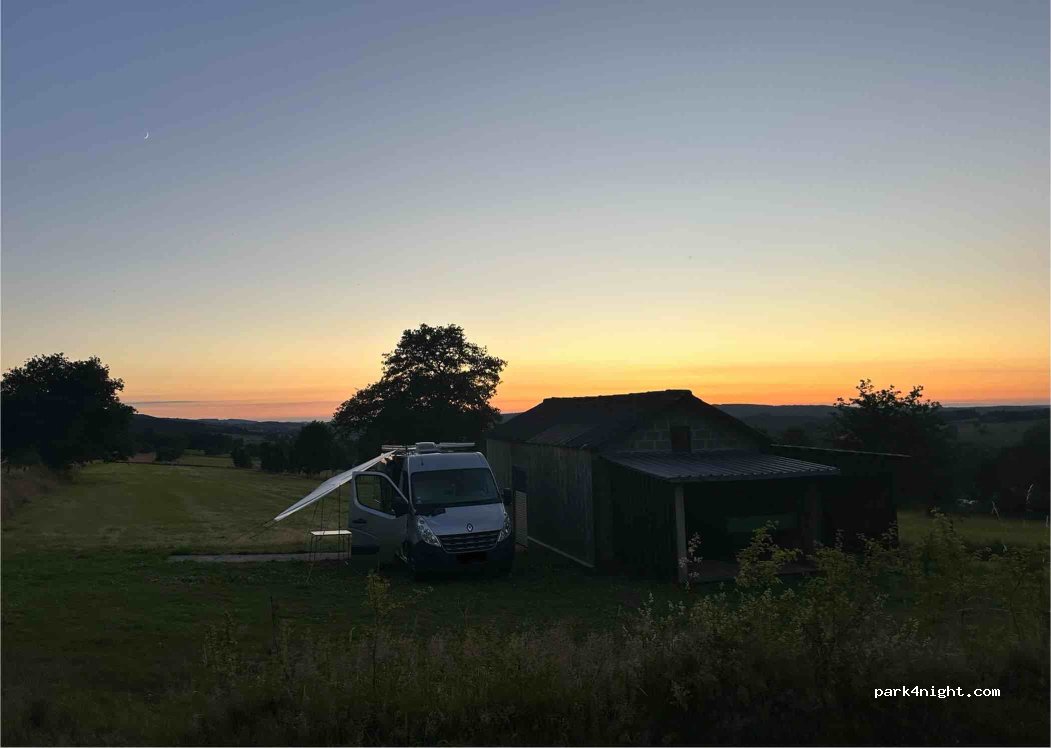 3 places pour van ou plusieurs tentes derrière un petit bâtiment dans un champ. Boîte aux lettres pour y laisser l'argent au propriétaire. Très belle vue, au calme. Forêt à 100 mètres. Le propriétaire laisse à disposition un tuyau d'eau potable. Pas de WC, pas d'électricité, pas d'eaux usées. Endroit calme. Il est demandé de ne pas être bruyant. Traces vtt à 50 mètres. Supermarché et centre ville à 3min en voiture. Bientôt : guirlande guinguette solaire pour rendre le lieu encore plus sympa...