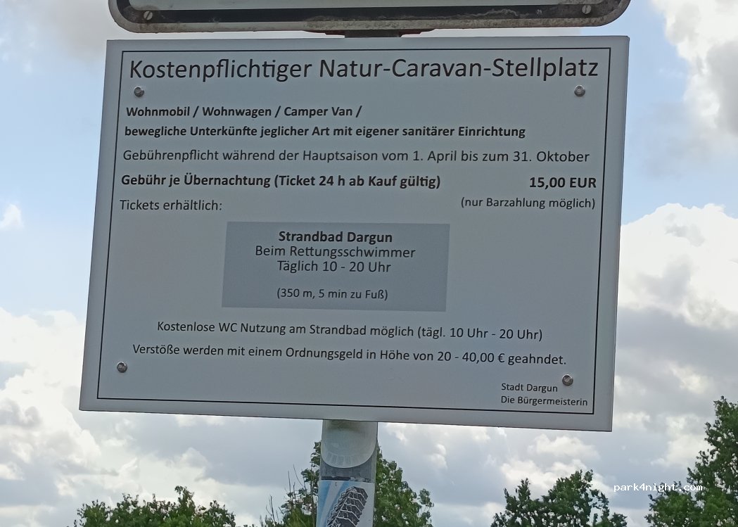 Wir sind sehr enttäuscht von der Stadt Dargun. Warum macht man diesen Preiswucher nur mit und vertreibt damit die Touristen aus der Stadt und Umgebung? 15 Euro für einen Platz auf dem es nichts weiter gibt ist ja wohl ein Witz. Uns sieht man hier nicht mehr und das Weiterempfehlen hat sich damit ja auch erübrigt.