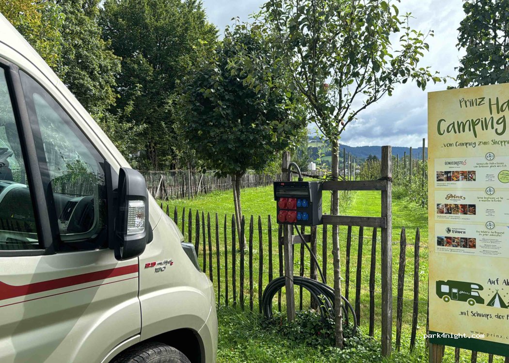 Der Stellplatz war nach dem Fest noch abgesperrt, man durfte aber am Rand des Privatweges zum Platz parken. Bis 7 Uhr morgens war es sehr ruhig. Der Hofladen ist sehr schön und die Adresse der „Genusskiste“ (Salvatorstrasse 2) ist eine gute Orientierung um den Stellplatz gut zu finden.