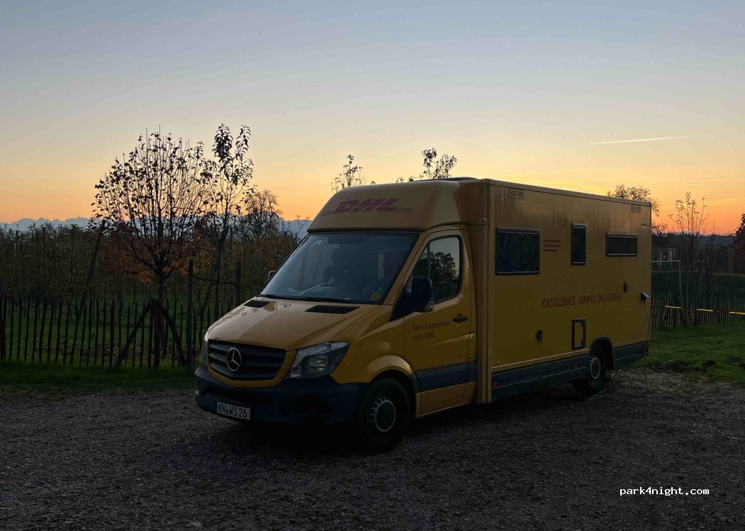 Beautiful spot in the apple orchards. Easily accessible from the highway. There's a farm shop (a "Genusskiste" (snack box) nearby, as well as a small bar among the apple trees in the summer. Electric hookups are available. The farm shop's staff restrooms are available during opening hours. Several gas stations are nearby, one of which offers laundry facilities.