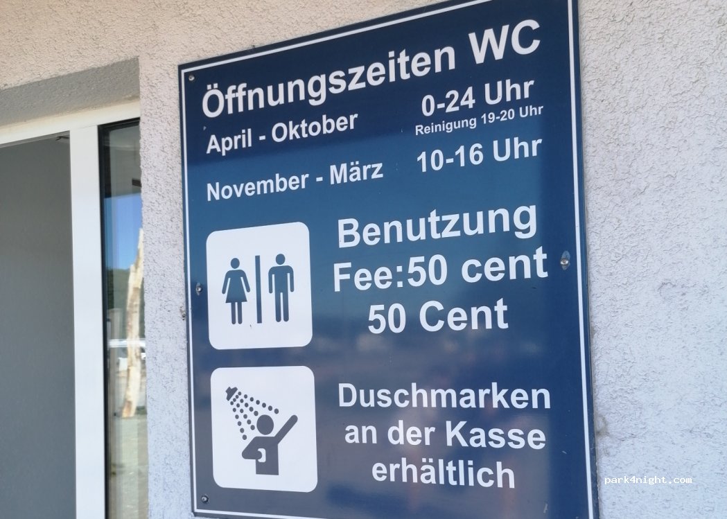 Achtung, Wasseranschluss außen ist derzeit abgeschaltet. Wasser kann nur in Flaschen oder kleine Kanister über Handwaschbecken aufgefüllt werden... Toiletten OK, Drehkreuz kann ohne Münzeinwurf passiert werden. Duschen sahen auch OK aus.