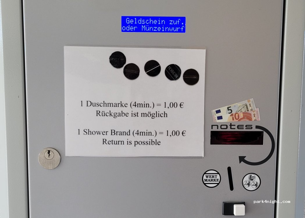 Haben hier eine Nacht auf dem Stellplatz verbracht. War soweit alles in Ordnung. Eingang zu den Toiletten und Duschen kostet 50 Cent. Es sind zwei separate Duschkabinen vorhanden. Duschen kostet dann für 4 Minuten 1 Euro. Die Marken werden an einem Automat im Gebäude/Durchgang gezogen. Dies betrifft allerdings nur das warme Wasser. Wer kalt duscht, muss nichts bezahlen.