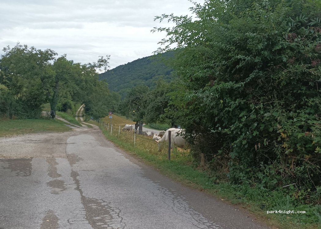 Parking next to the road, quiet, close to the village, with water tap and toilets. Next to a volleyball court.