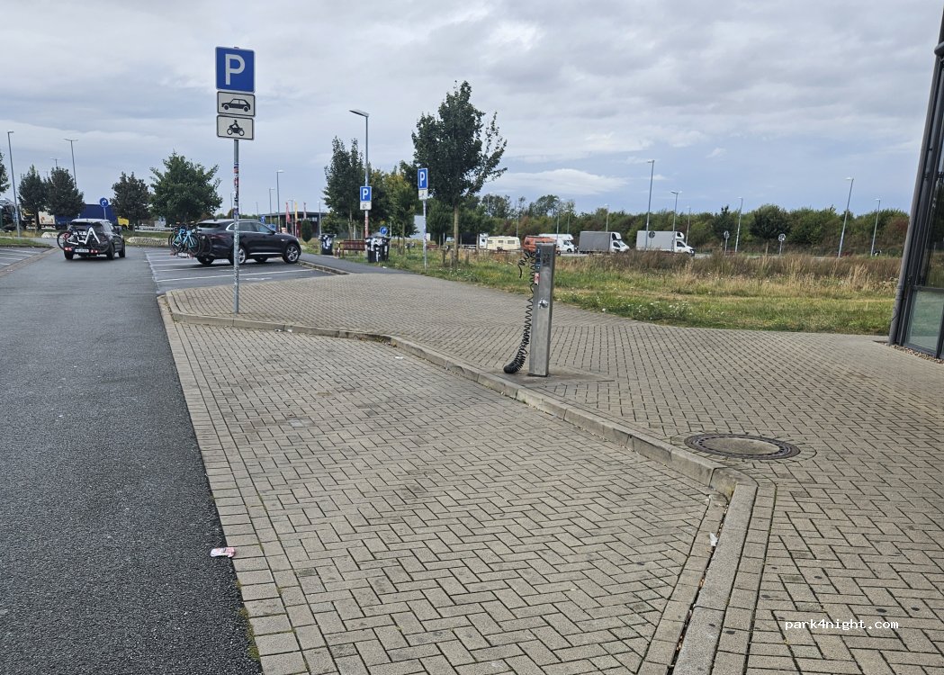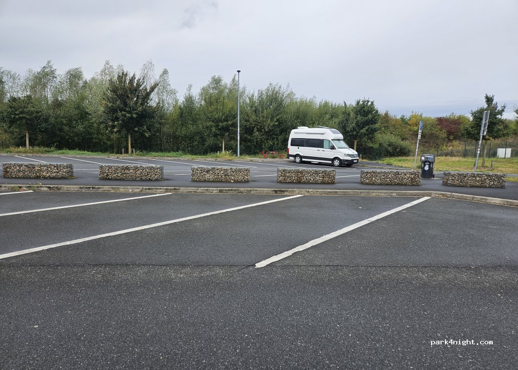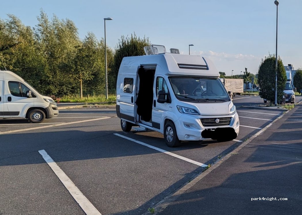 bardzo duży parking mieszczą się kampery do 7 m jest gdzie nabrać wodę rano można zjeść śniadanie w restauracji obok są toalety są też prysznice choć nie korzystaliśmy bezpiecznie wcale nie jest głośno bo miejsce dobrze oddalone od autostrady dużo tirów warto się zatrzymać na jedną noc w podróży kamperem