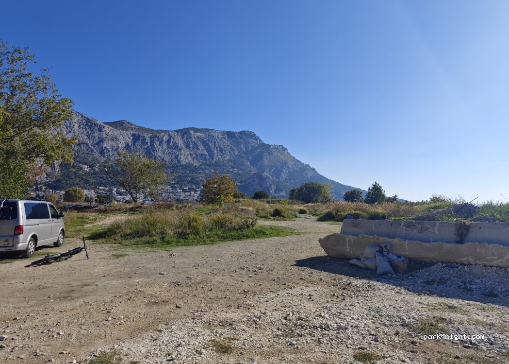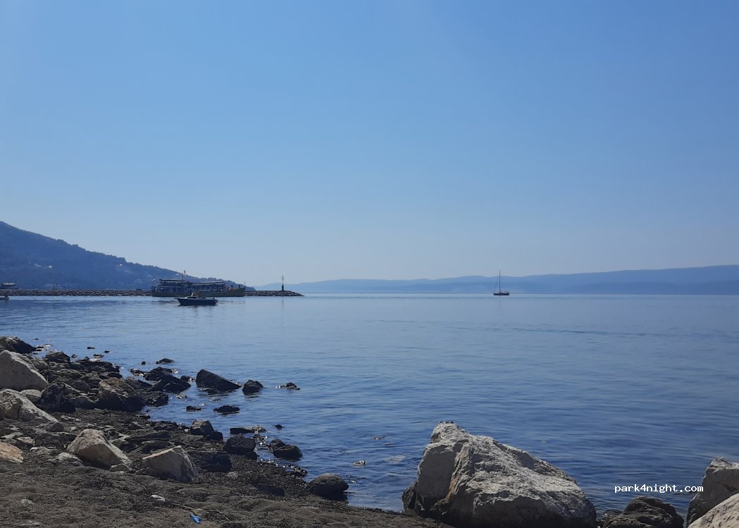 You have two options. One is paid asphalt parking behind sport hall. Its illuminated and there can be some noise from cars and sport hall. Other option is wild parking lot bellow the trees or even closer to the sea. There are some trash around, but not too bad. Quiet and calm.