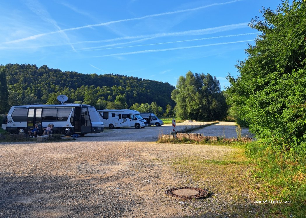 Parkplatz wird von der Stadt noch geduldet, Standort hinter dem Schwimmbadparkplatz, nach dem PKW P6. Ebenerdig, geeignet für ca. zehn Wohnmobile. Bitte keine Stühle und Tische!