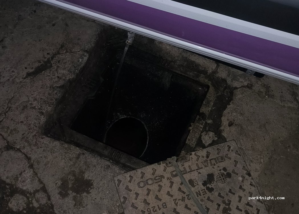 Zona de desagüe de aguas residuales o aseos cerca de la zona de aparcamiento. Punto de agua negro como se indica en la imagen, pero es solo un agujero en el suelo cubierto con una lámina de metal. Sin aguas grises y sin recarga.