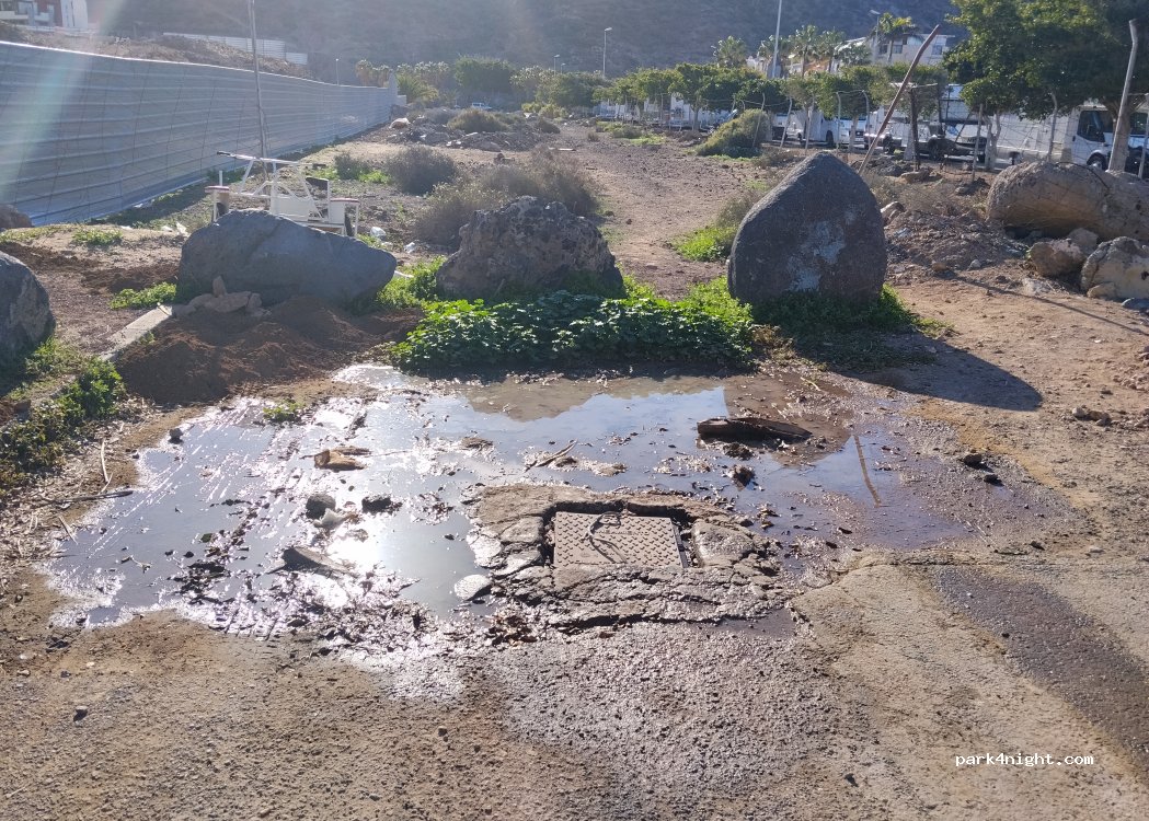 Al lado del punto de servicio, hay aparcamiento, autorizada la pernocta para autocaravanas, en dos calles muy tranquilas, con capacidad de aparcamiento para unos 50 vehículos. El lugar está muy próximo al centro urbano de Los Cristianos al lado del mar.